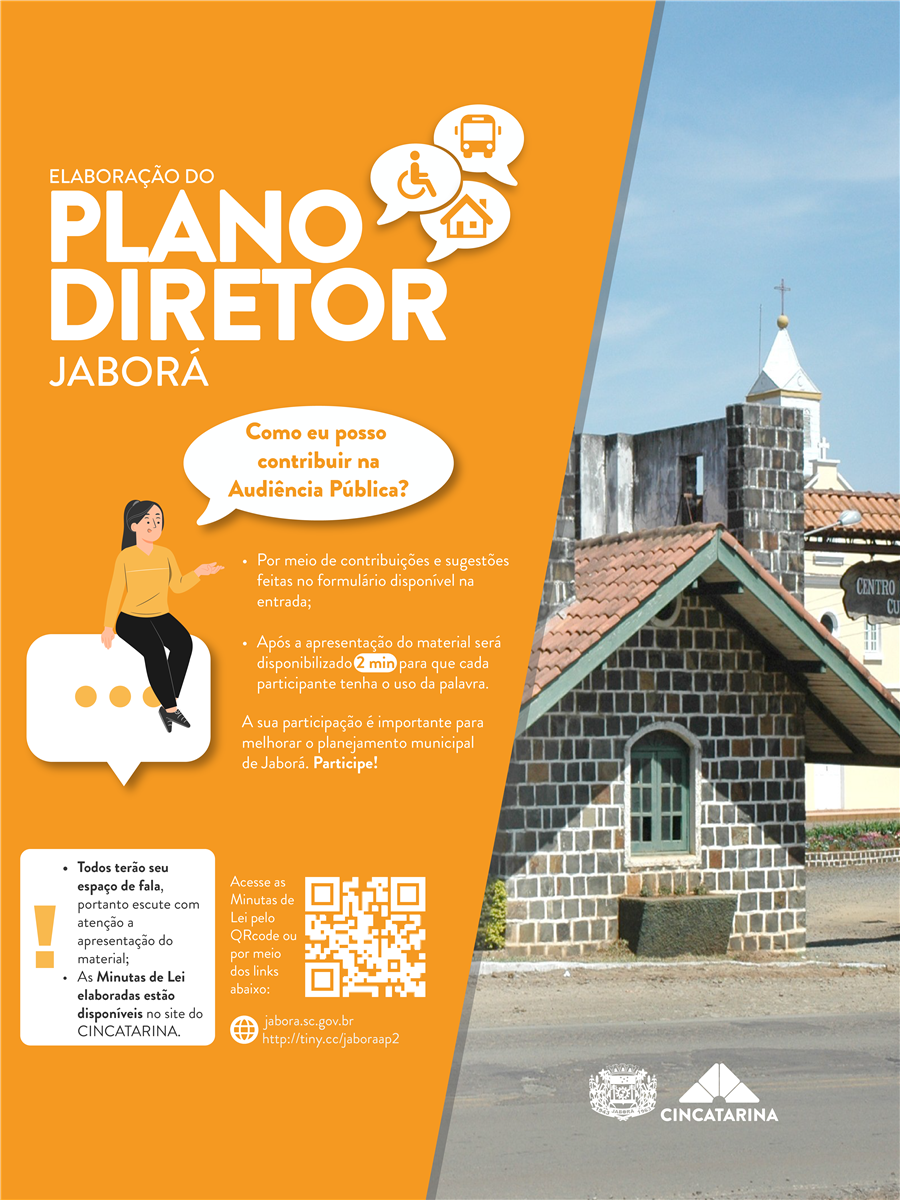O Município de Jaborá, por meio do Consórcio Interfederativo Santa Catarina - CINCATARINA, tem a honra de convidar Vossa Senhoria para participar da Audiência Pública de Elaboração do Plano Diretor de Jaborá, na qual serão apresentadas a Lei de Uso e Ocupação do Solo e a Lei de Parcelamento do Solo.