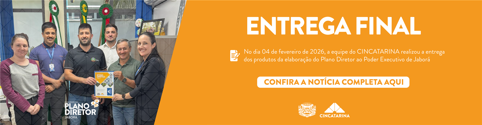 Após a finalização dos materiais, o CINCATARINA entregou os produtos da elaboração do Plano Diretor ao Poder Executivo de Jaborá, no dia 04 de fevereiro de 2026. Conforme a metodologia, o Poder Executivo Municipal deve encaminhar as minutas de lei à Câmara de Vereadores, cabendo aos vereadores a discussão e aprovação dos projetos de lei, para posterior sanção.
